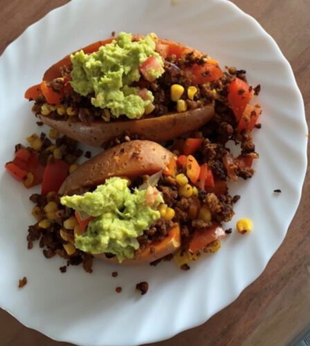 Laat je verrassen door de 'Gepofte zoete aardappel'! Deze eenvoudige, maar heerlijke maaltijd combineert zachte, gepofte aardappelen met een hartige vulling van gekruid gehakt en frisse guacamole. Een perfect gerecht voor een voedzame doordeweekse avond. Snel te bereiden en vol van smaak!