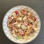 - Verhit de kokosolie in een pan en fruit de (helft van de) rode ui en de knoflook aan. Voeg vervolgens het gehakt toe en bak het rul. Breng op smaak met de gehaktkruiden.