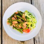 - Schik alle bereide ingrediënten – zalm, linzen, paprika, komkommer, wortelen en sla – in een bowl. Maak de bowl af met de zongedroogde tomaatjes en de noten en zaden naar keuze.
