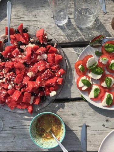 Watermeloen met munt, feta, zwarte olijven en gemarineerde rode ui