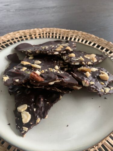 Verwen jezelf met deze onweerstaanbare 'Chocolade gevuld met noten'! Een eenvoudige en snelle traktatie die de rijke smaak van pure chocolade combineert met de heerlijke crunch van geroosterde noten en zaden. Perfect voor een luxe momentje voor jezelf of als smaakvolle verrassing voor gasten. Geniet van deze lekkernij!
